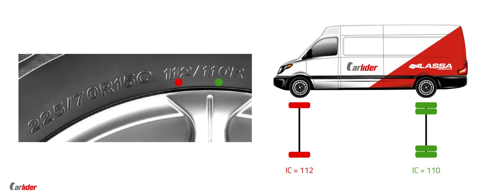 A diferencia de los neumáticos de turismo, los neumáticos de vehículos comerciales (furgonetas) a menudo llevan doble índice de carga.
