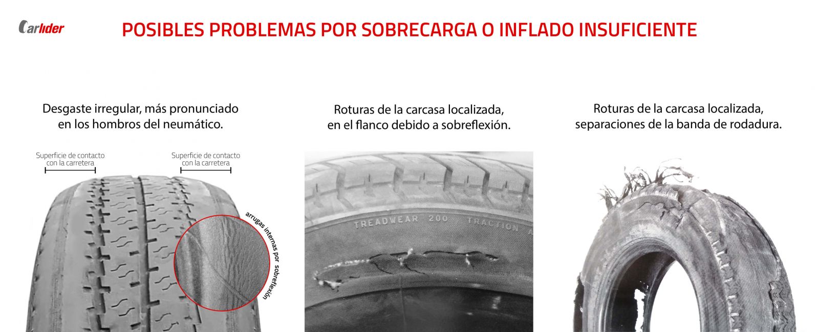 Las consecuencias de las cargas excesivas en los neumáticos son casi idénticas a las de un inflado insuficiente, pues que un neumático esté sobrecargado no quiere decir que tenga exceso de carga, puede deberse a baja presión.