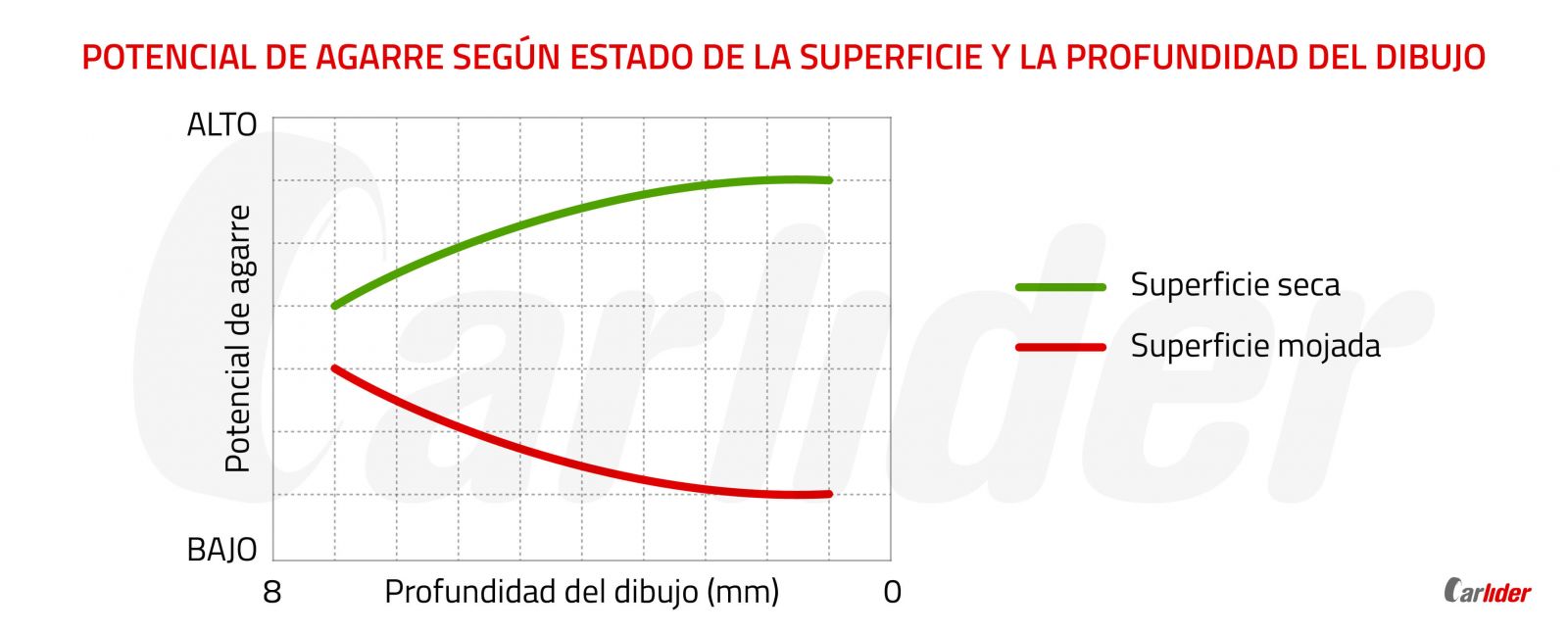 La mayoría de neumáticos para turismos tienen unos 8mm de profundidad en la banda de rodadura. Su principal misión es garantizar el agarre del neumático a la superficie, incrementándose el agarre en superficies secas conforme disminuye la profundidad del dibujo, sin embargo, en superficie mojada ocurre lo contrario.