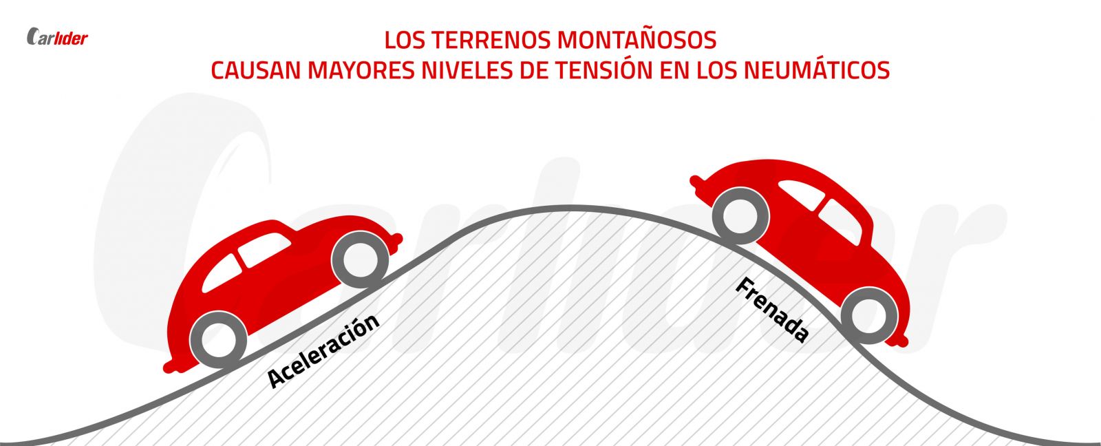 Los terrenos montañosos aumentan la frecuencia de aceleraciones y frenadas, causando mayores niveles de tensión en los neumáticos.