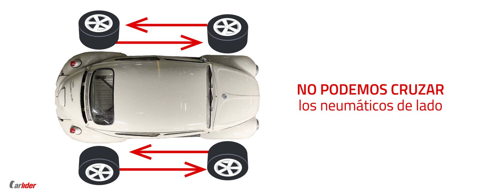 No podemos cruzar los neumáticos de lado, esto es debido a que los neumáticos hoy en día están construidos en base a una estructura de cordones de nylon y acero (entre otros materiales como vimos en este artículo), que una vez recorridos un número de kilómetros tienden a coger forma y si modificamos su posición cambiando el sentido de giro del neumático (independientemente del diseño que tenga la banda de rodadura) pueden surgir deformaciones y éstas transmitir vibraciones.