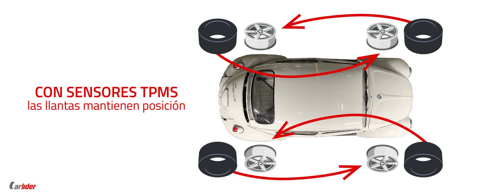 Si el vehículo tiene instalado sensores TPMS en las llantas, no podemos trasladar la rueda completa de sitio para no interferir en la transmisión de datos, sino que habría que mantener las llantas en la misma posición de origen y mover sólo los neumáticos.