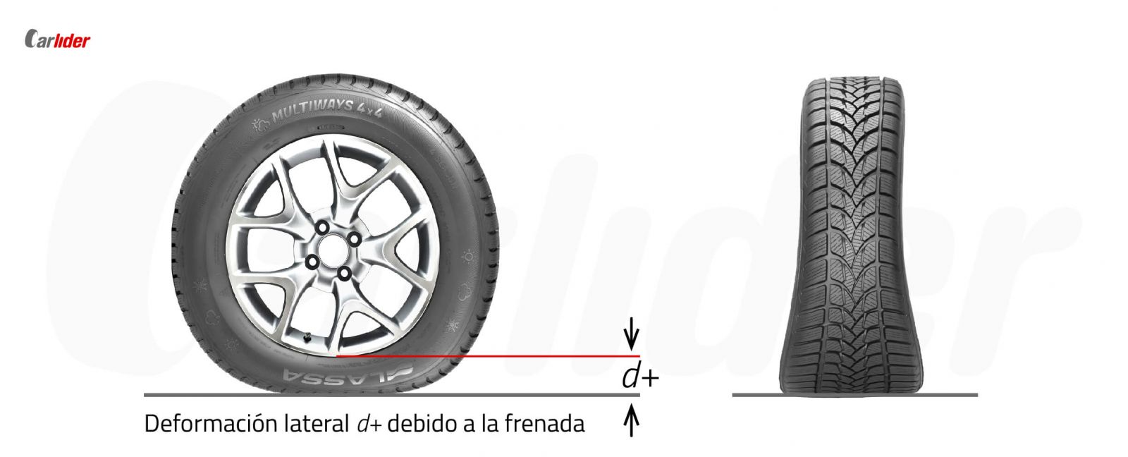 En esta ilustración, el neumático está siendo frenado y la deformación lateral (d+) es mucho mayor debido a la mayor carga impuesta en el neumático.