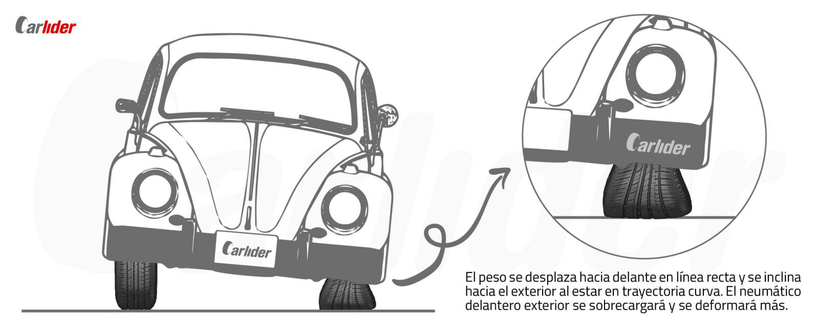 El peso del vehículo se desplaza hacia delante en línea recta y se inclina hacia el exterior al estar en trayectoria curva. El neumático delantero situado en el lado exterior se sobrecargará y se deformará más debido a la fuerza centrífuga mientras que el trasero del lado interior de la curva no tendrá adherencia, pudiendo quedar incluso en el aire.