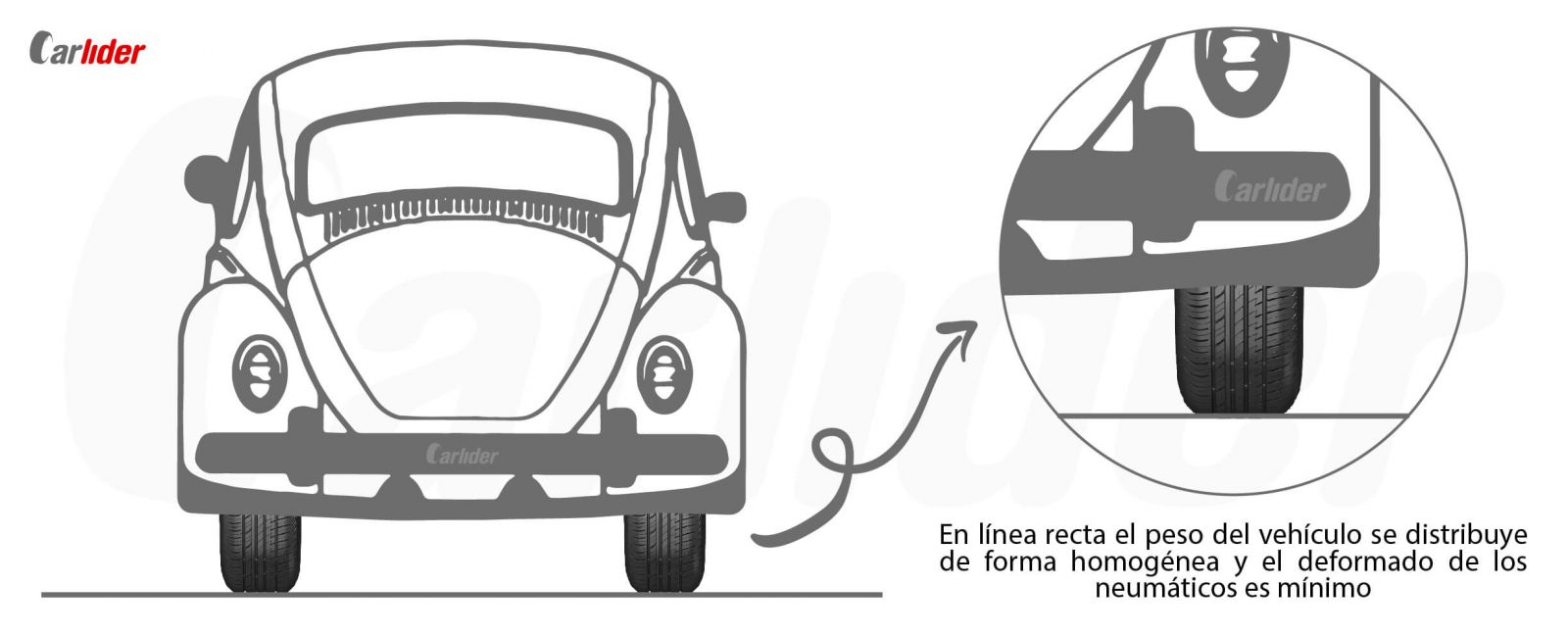 Cuando se conduce en línea recta, el peso de vehículo se distribuye por igual sobre las cuatro ruedas, y la deformación de los neumáticos es mínima siempre que las presiones del neumático sean las adecuadas para las condiciones operativas del vehículo.