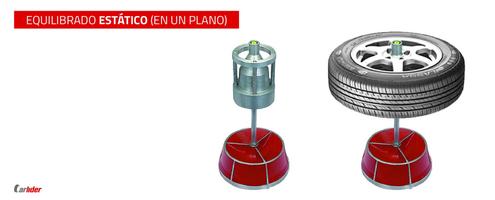 [1] Estático (un plano): Es un equilibrado muy simple (no recomendamos su uso) ya que solo tiene en cuenta un plano de la rueda. El método es muy sencillo, se coloca la rueda sobre un soporte vertical con un nivel de burbuja al centro. El lado más pesado de la rueda se moverá hacia abajo, colocando el técnico especialista los pesos correspondientes justo al lado contrario para compensar. Los pesos solo estarán en un lado de la rueda, pero claro, si el desequilibrio es más complejo, este método es insuficiente.
