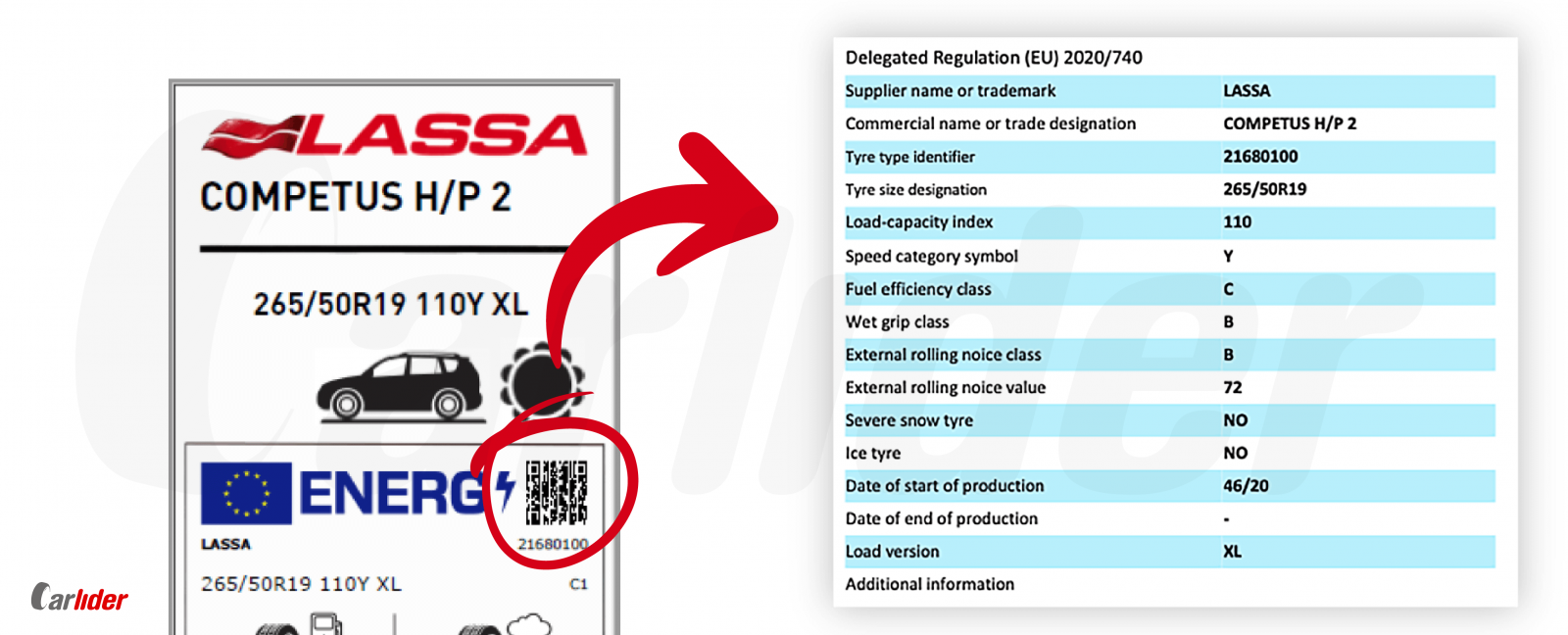 1. Código QR. Los consumidores pueden descargar una ficha de información sobre cada neumático leyendo el código QR que aparece en la parte superior derecha de la etiqueta. El código QR proporciona un enlace a una base de datos EPREL (European Product Registry for Energy Labelling) que contiene una ficha informativa más detallada del producto incluyendo: Información que se muestra en la etiqueta de la UE en forma de tabla, fecha de inicio de producción y fecha de finalización de la producción (la agregará el fabricante, cuando se conozca). Por ejemplo: