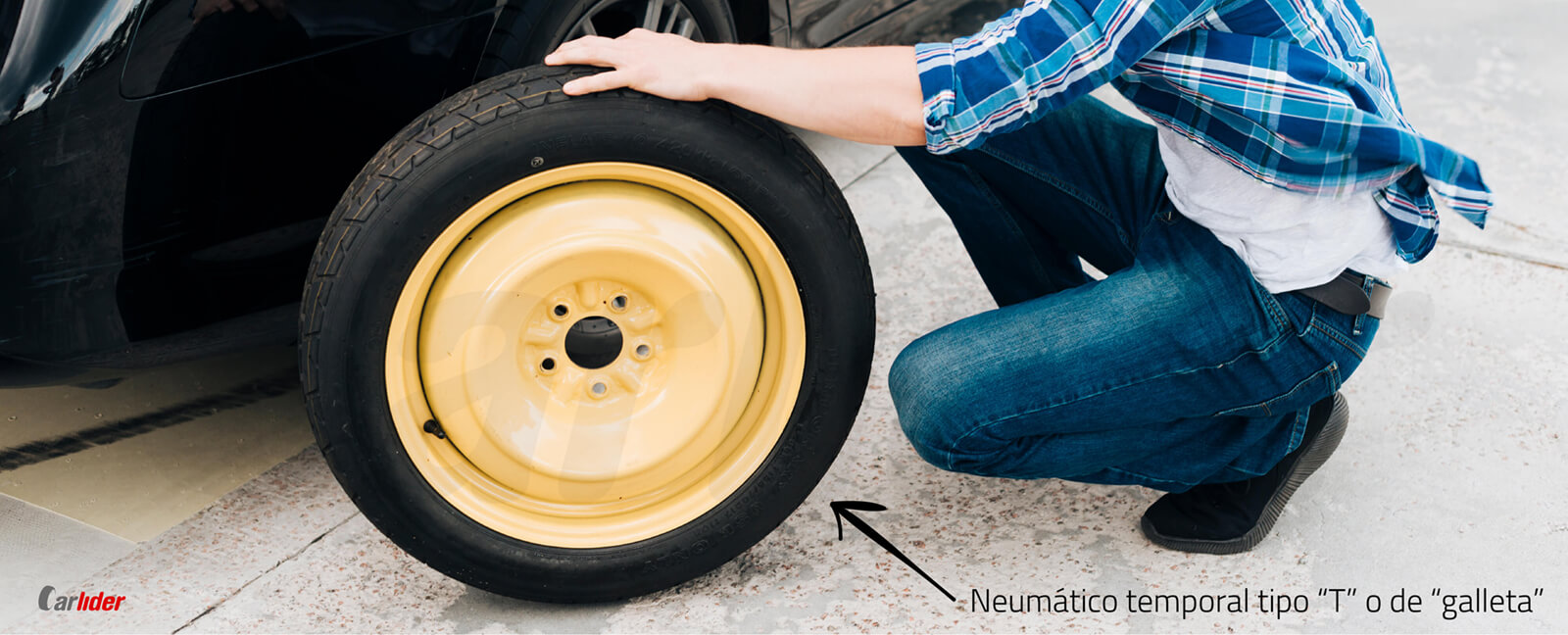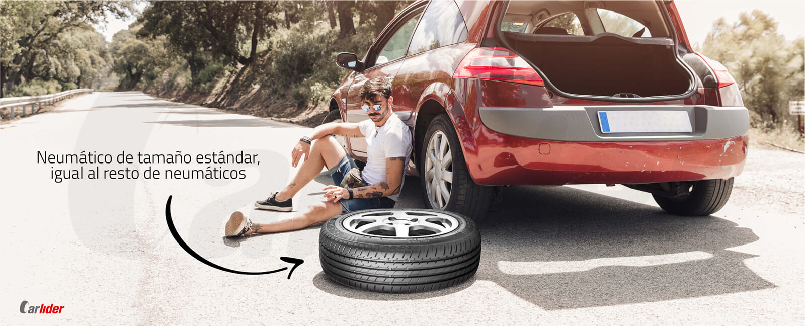 También llamado de repuesto, y como su propio nombre indica, es un neumático para uso provisional. Puede ser igual que el resto de neumáticos que llevas en el coche, puede ser totalmente diferente o puede que no exista.