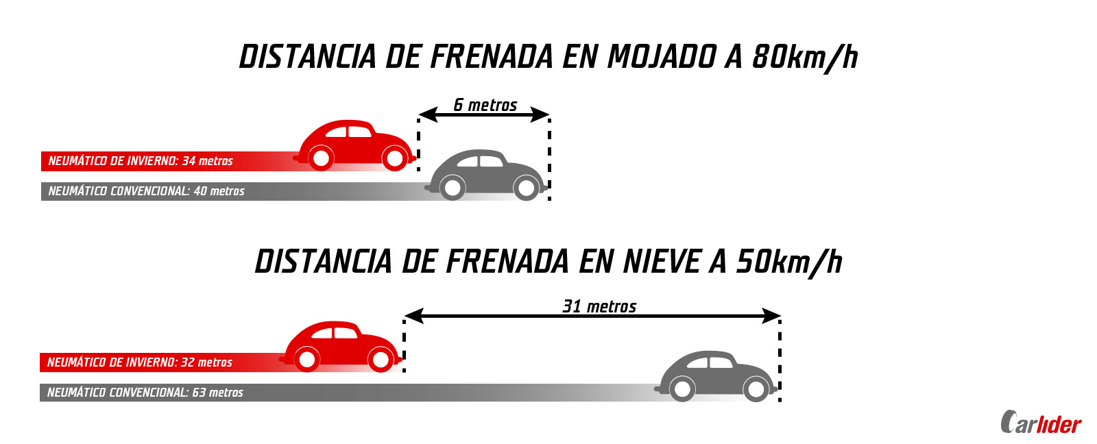 La distancia de frenada es otro aspecto importante, en la imagen anterior vemos dos situaciones, una con superficie mojada y otra con superficie nevada, y a diferentes velocidades, comparamos neumáticos de invierno frente a neumáticos convencionales. En la primera situación, vemos que la diferencia de frenada a 80km/h en superficie mojada, es de 6 metros de diferencia. En la segunda situación, sobre superficie nevada, vemos que a menor velocidad, la distancia de frenada es de 31 metros.