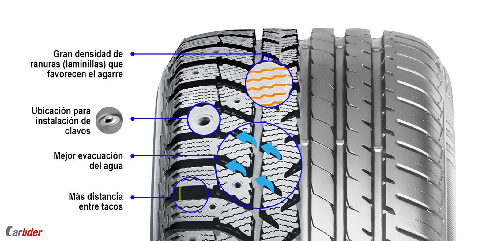A diferencia de los neumáticos de verano, los neumáticos de invierno presentan en la banda de rodadura surcos más anchos y unas hendiduras y aristas adicionales, todo diseñado para una mejor evacuación y tracción sobre superficies heladas o nevadas, es decir, están diseñados especialmente para combatir las peores condiciones climatológicas.