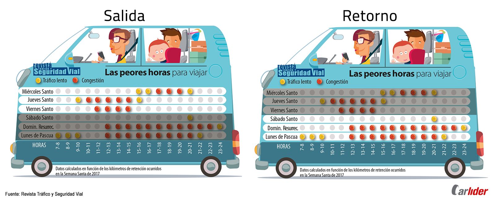 Elegir la hora para iniciar el viaje –tanto a la salida como al regreso de vacaciones– puede condicionar el mismo. La DGT nos advierte en qué horas y días se espera la mayor afluencia de vehículos en las carreteras. Si tiene la posibilidad de adelantar o retrasar su salida, podría evitarse los momentos 'punta' en los que las congestiones pueden degenerar en retenciones, atascos, nervios, cansancio e, incluso, provocar accidentes, leves o graves.
