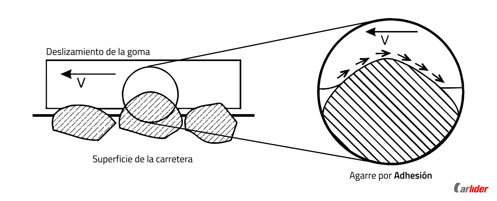 - Agarre por adhesión. Los átomos de dos cuerpos en contacto, sean rígidos o no, desarrollan una pequeña fuerza electromagnética de atracción mutua. La adhesión será mayor cuanta más superficie de contacto exista entre ambos cuerpos (asfalto y neumático) y que ésta esté limpia. Un claro ejemplo es el agua, cuanta más agua se acumule en la superficie menor adherencia tendrá el neumático, llegando a darse el aquaplaning.