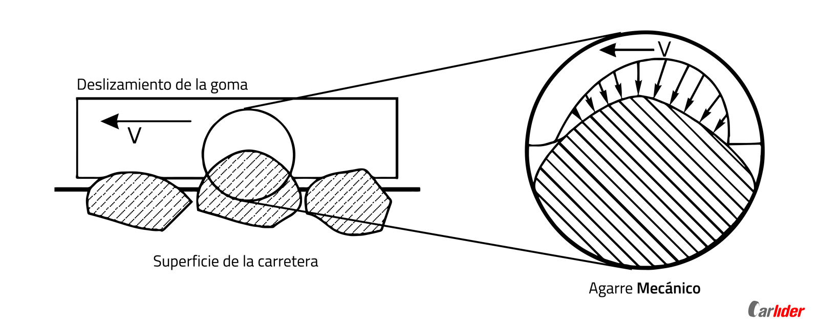 - Agarre mecánico. El asfalto es una superficie rugosa, esas irregularidades fomentan el agarre mecánico pues el neumático (con carga), por su comportamiento viscoelástico provoca una deformación que hace que “abrace” esas irregularidades de manera asimétrica contribuyendo a la fuerza de fricción total. Éste fenómeno se conoce como histéresis.