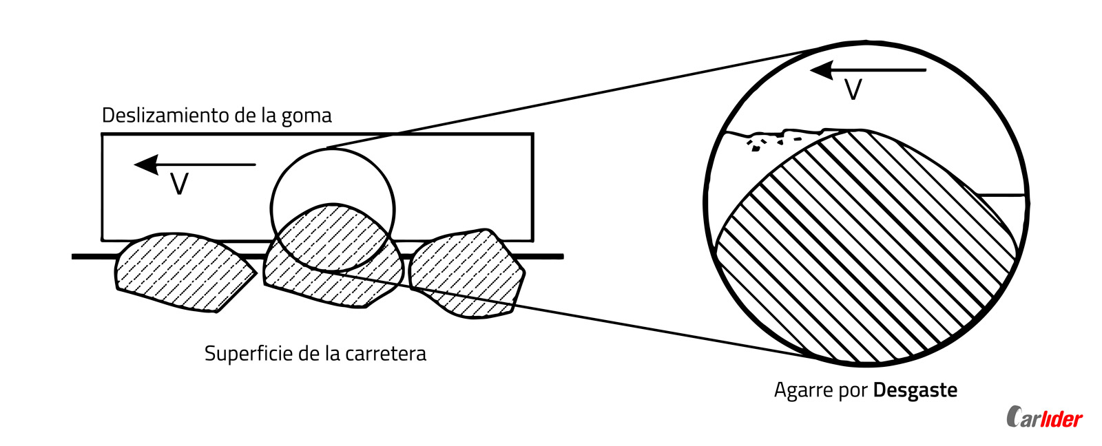 - Agarre por desgaste. Definido cómo la pérdida progresiva del material de la superficie de la zona de contacto de dos cuerpos sometidos bajo carga, en movimiento relativo. El neumático, como cualquier material, tiene un límite de resistencia y a partir de cierta presión se desgarra, pero que no cunda el pánico, no estamos hablando de trozos grandes de goma, por regla general son pequeñísimas virutas de goma.