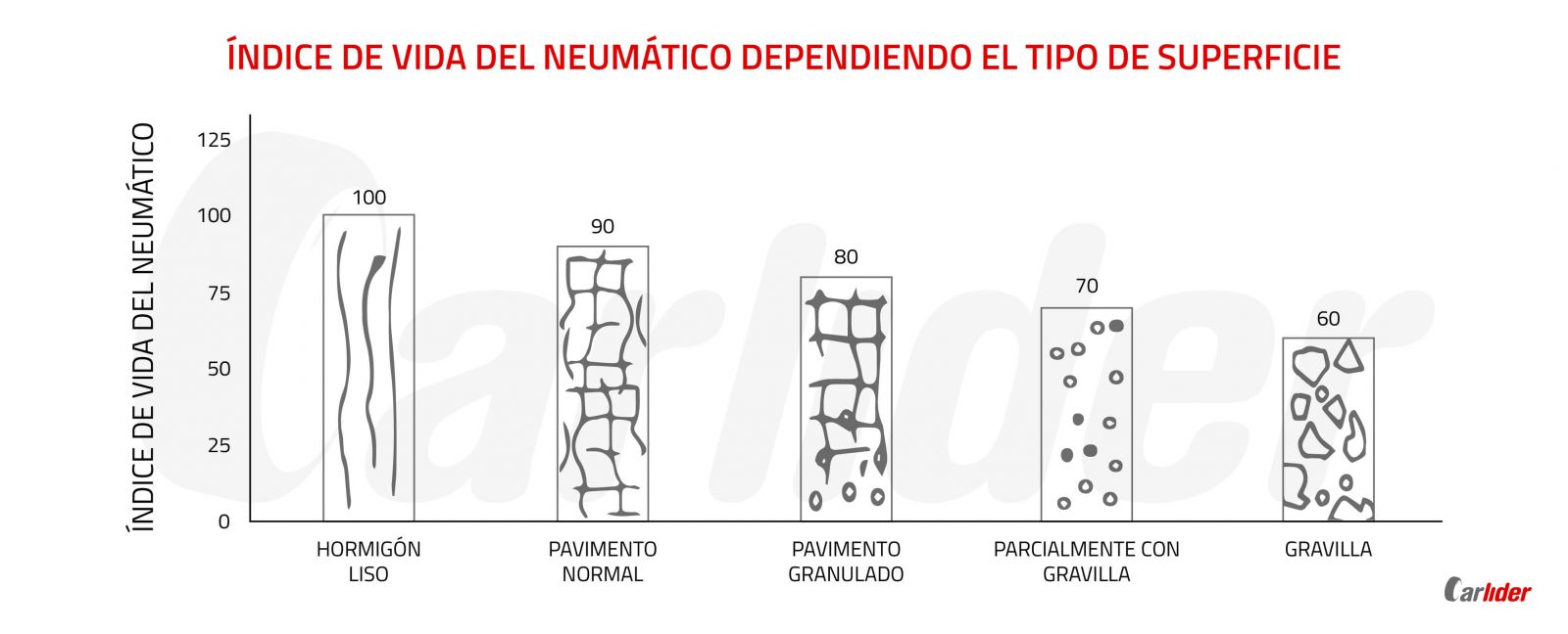 - Estado del vehículo. También la correcta geometría de las suspensiones y el estado de la amortiguación tiene casi tanta influencia en el desgaste prematuro como el tipo de carretera, ya que unas cotas incorrectas generan desgastes irregulares acortando la vida útil del neumático.